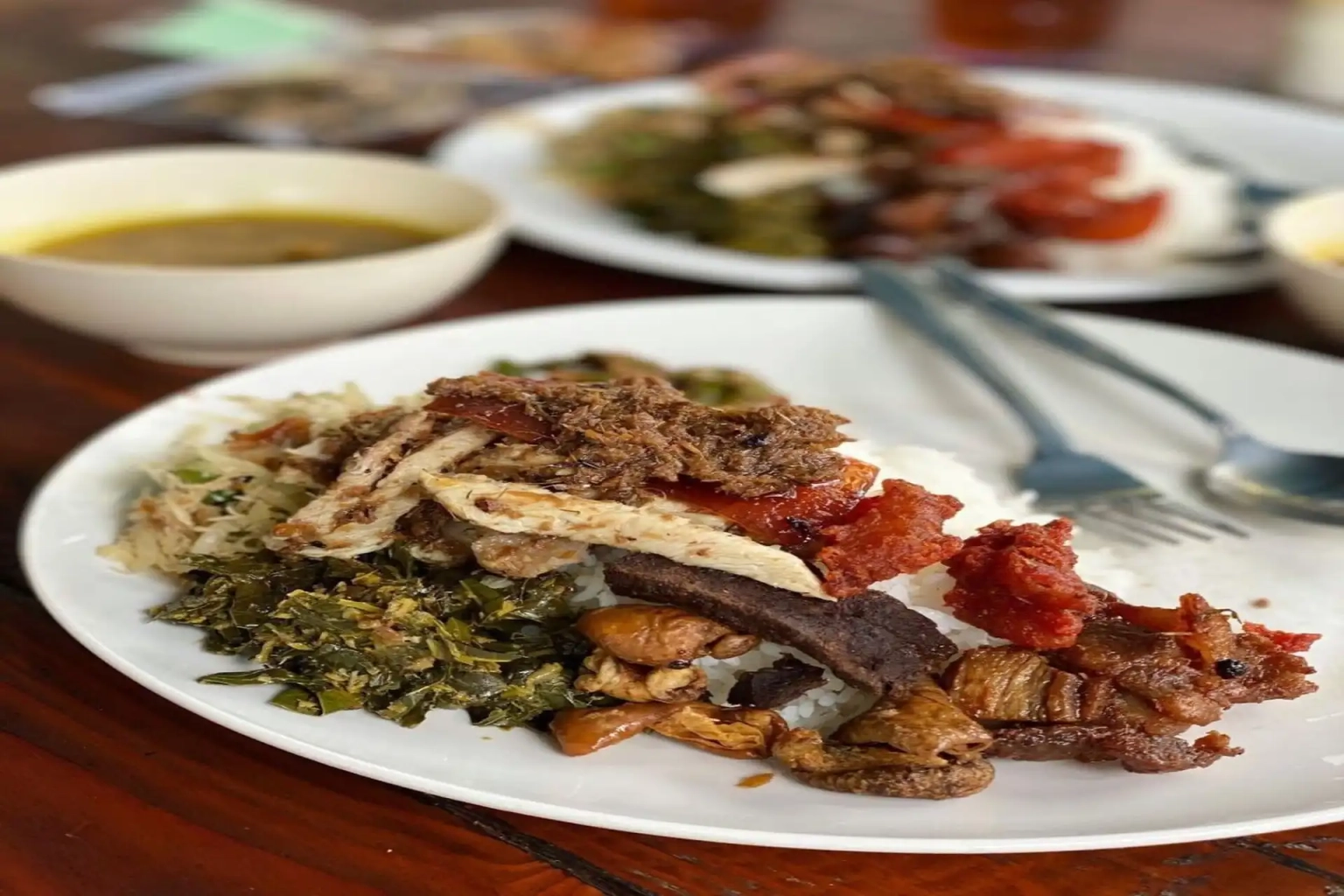 Balinese Nasi Campur, which literally translates to “mixed rice,” is a popular Balinese dish among locals and visitors alike. People commonly consume it for breakfast, brunch, lunch, and dinner.The dish is similar to a pick-and-mix selection, featuring an assortment of Indonesia’s best bites. Authentically good Nasi Campur typically includes Ayam Panggang (grilled chicken) or Ayam Betutu, White Lawar, Sate Lilit, and a variety of hot sambals. To experience the best Nasi Campur, look for buffet-style warungs that allow customers to select from dishes displayed in glass cabinets.