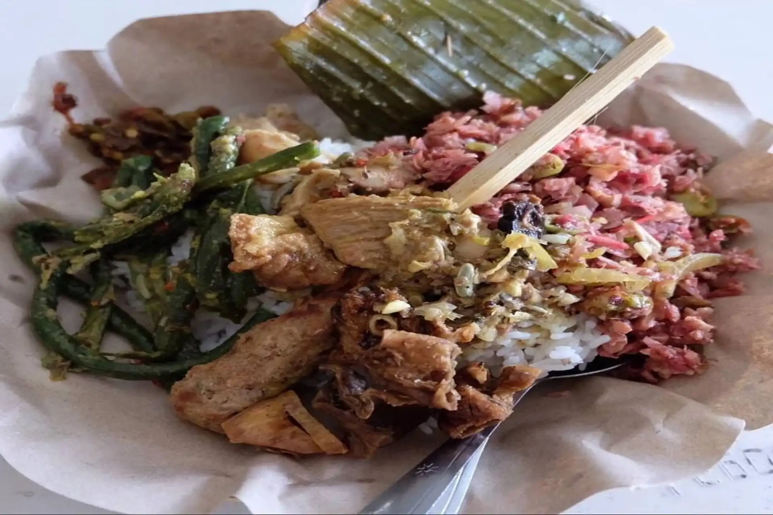 Lawar is a Balinese dish that consists of chopped meat mixed with a variety of green vegetables and grated coconut. The meat options include beef, chicken, duck, pork, turtle, or a combination of these. In Bali, there are two types of lawar: red and white. The red lawar gets its colour from adding animal blood, which imparts a distinct savoury flavour. White lawar, in contrast, does not contain blood and frequently substitutes meat with jackfruit. Lawar is often served at celebrations and special occasions, as it’s a dish that’s reserved for special guests. Best place you can eat Lawar is on Warung Pengkol. Why did we recommend this place? They have a nice service and the price is cheap for you to eat Lawar in Bali.